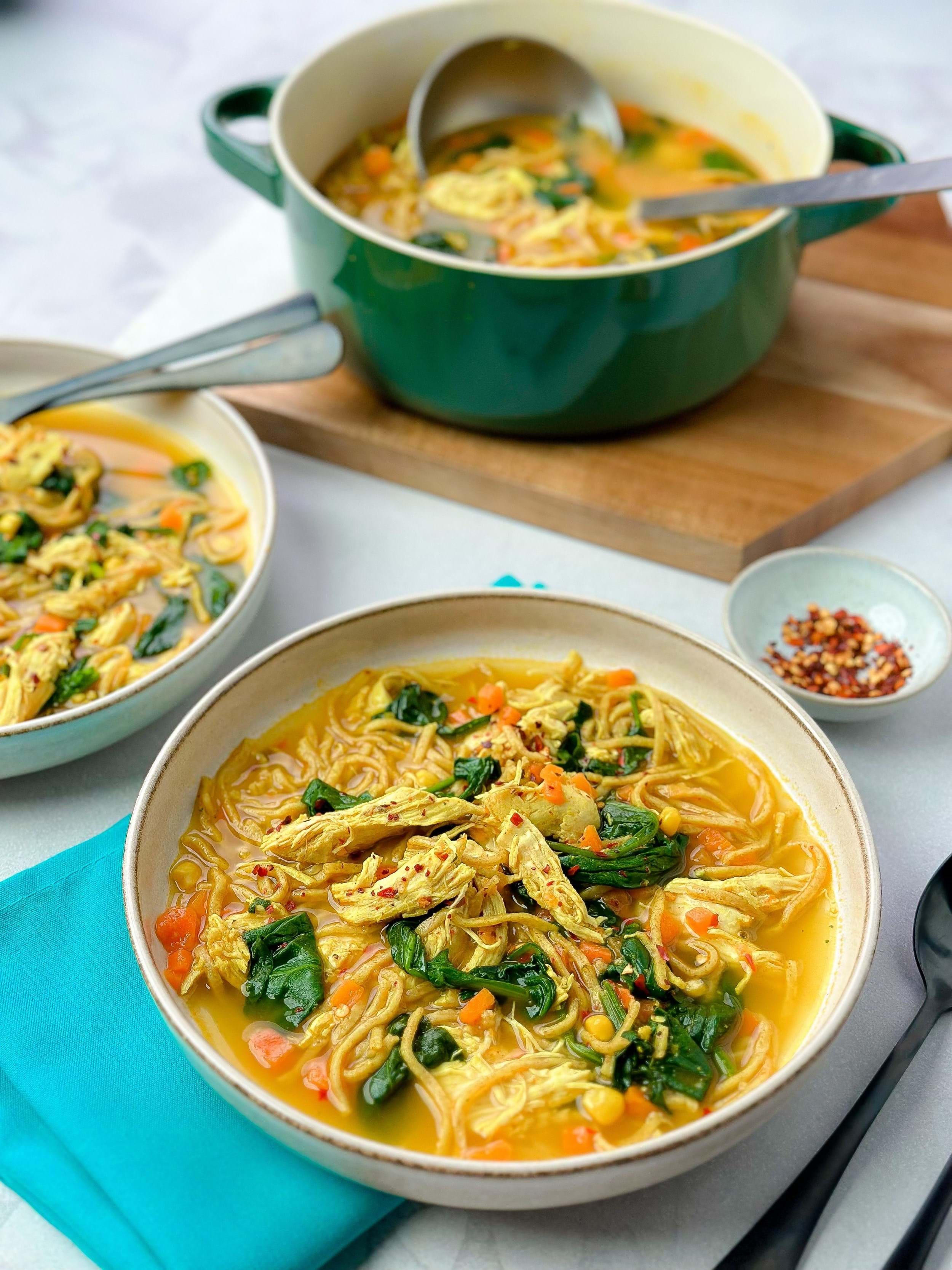 Each serving of our chicken noodle soup costs just 84p to create, with a total recipe cost of £3.37 for four people, and it takes just 10 minutes to prep – simply leave to cook away on the stove for 30 minutes and then you’re done.